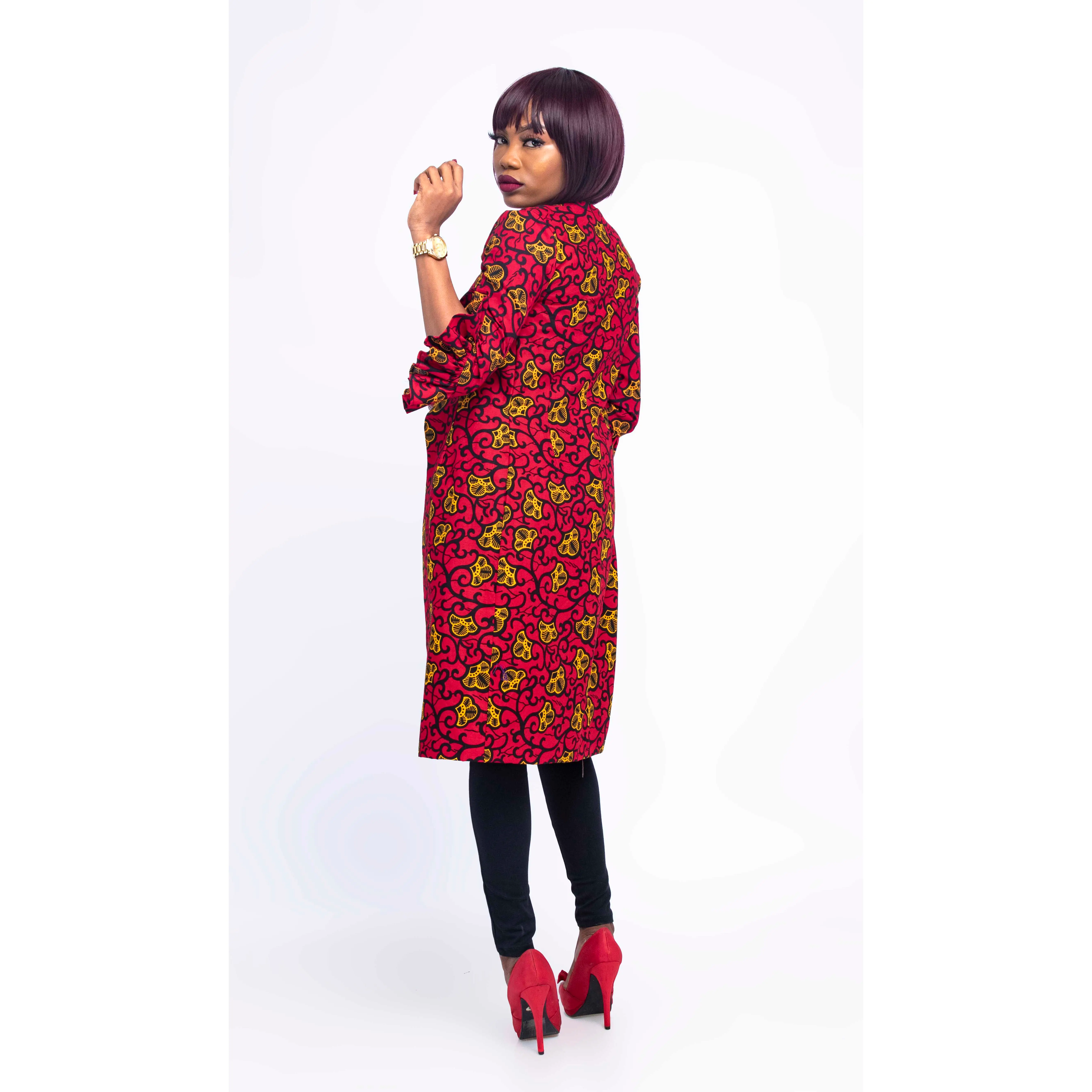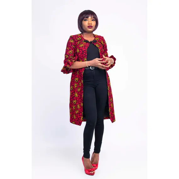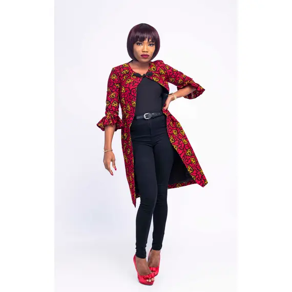 This African print coat and crop top saves you the headache of a camisole. It can be worn for every occasion. It’s trendy and stylish with a lovely sleeve and button at top center front. You can pair with a pant, leggings or pencil dress. Ify African coat dress let your look speak classy.