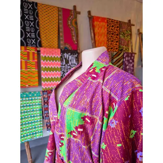 This stylish kimono is made from premium Ankara print cotton, offering a vibrant, modern twist on a traditional silhouette. Designed for comfort and elegance, it features a matching fabric belt for adjustable fit and two practical side pockets. Perfect for lounging, casual outings, or layering over your favorite outfits. Proudly made in Rwanda, it combines quality, culture, and functionality in one beautiful piece.
