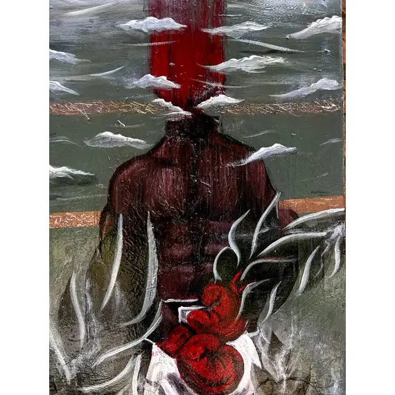 Real Roots is a powerful original acrylic painting that explores the tension between mind and body, strength and emotional turmoil. A muscular back faces away, grounded and strong, while the figure’s head dissolves into red streaks that melt into a cloudy sky—symbolizing overwhelming thoughts or inner conflict.