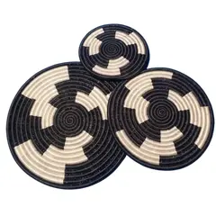 Elevate your home décor with this stunning set of three woven decorative plates, inspired by the traditional  Imigongo  art style of Rwanda. Carefully handwoven by artisans, each plate showcases intricate geometric patterns in earthy tones, perfect for wall displays or table arrangements....