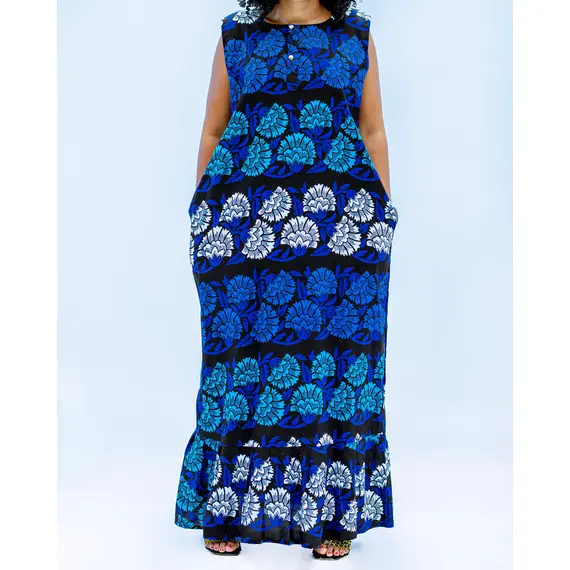 Sleeveless dress with a stunning blue floral African print.Made from soft, premium fabric for a smooth and comfortable wearing experience.Innovative design that highlights the personality and style of the wearer.The flattering cut and shape create a beautiful silhouette, accentuating curves.Available in various sizes; please check the size chart for a perfect fit.