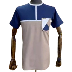 This is stylish short-sleeve men's shirt with features a modern color-block design with a navy blue top section, a beige lower section, and white trimming that outlines the upper chest and collar area. It also has a distinctive front pocket with a diagonal navy and beige pattern, adding a fashionable and contemporary touch.
