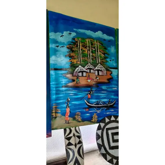 Hand Painted, Celebrite the vibrant spirit of rwandan culture with this hand painted artwork depicting traditional culture, the background patterns and additional paintings symbolize both rural life and modern growth  perfect for home decor, cultural spaces or art collectors who value african heritage